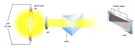 الطيف الخطي: يتميز بوجود خطوط في الطيف المرئي اما ظاهرة و تسمى انبعاث و اما معتمة و تسمى امتصاص تنتج عند مرور ضوء ابيض من غاز معين